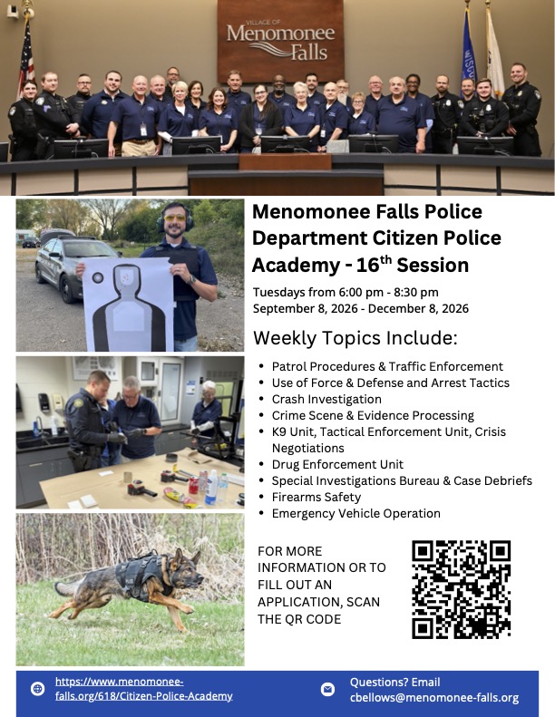 We highly encourage everyone to take part in the Menomonee Falls Citizens Academy if you have the opportunity! It’s an engaging, worthwhile experience you won’t want to miss. See details below!